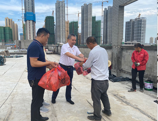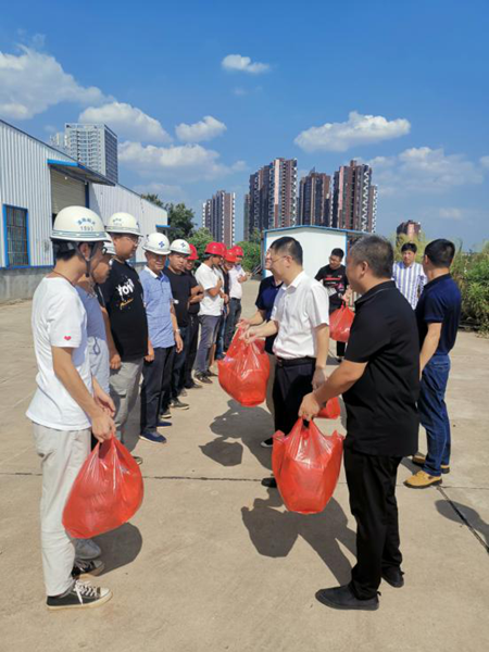 “火热的天气,你们坚守户外一线,为衡阳的建设和发展付出了辛勤的汗水,大家辛苦了!”8月24日下午,党委书记、董事长刘军同志来到幸福河项目建设工地,看望慰问奋战在高温一线的劳动者,切实落实市总工会衡工发〔2020〕23 号文《关于开展 2020 年“夏送清凉”活动的通知》工作安排,把党委和工会的关爱和“清凉”一起送到一线职工、农民工的心坎上。