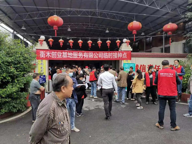 为协助属地政府集中做好新冠疫苗接种工作,5月25日至5月27日,衡木创业基地服务有限公司党支部在园区设立新冠疫苗临时接种点,前来接种新冠疫苗的居民群众佩戴口罩,有序排队等待接种。